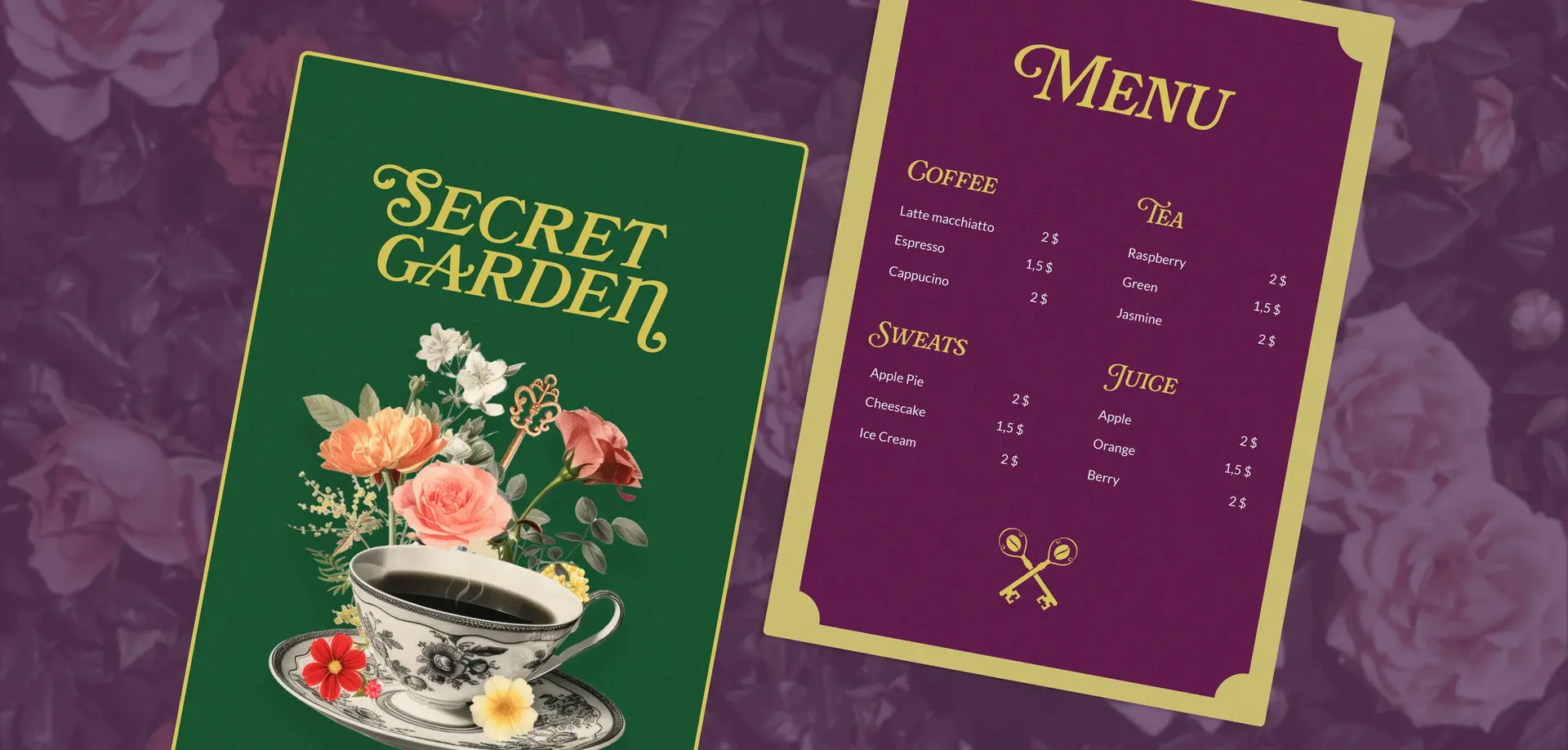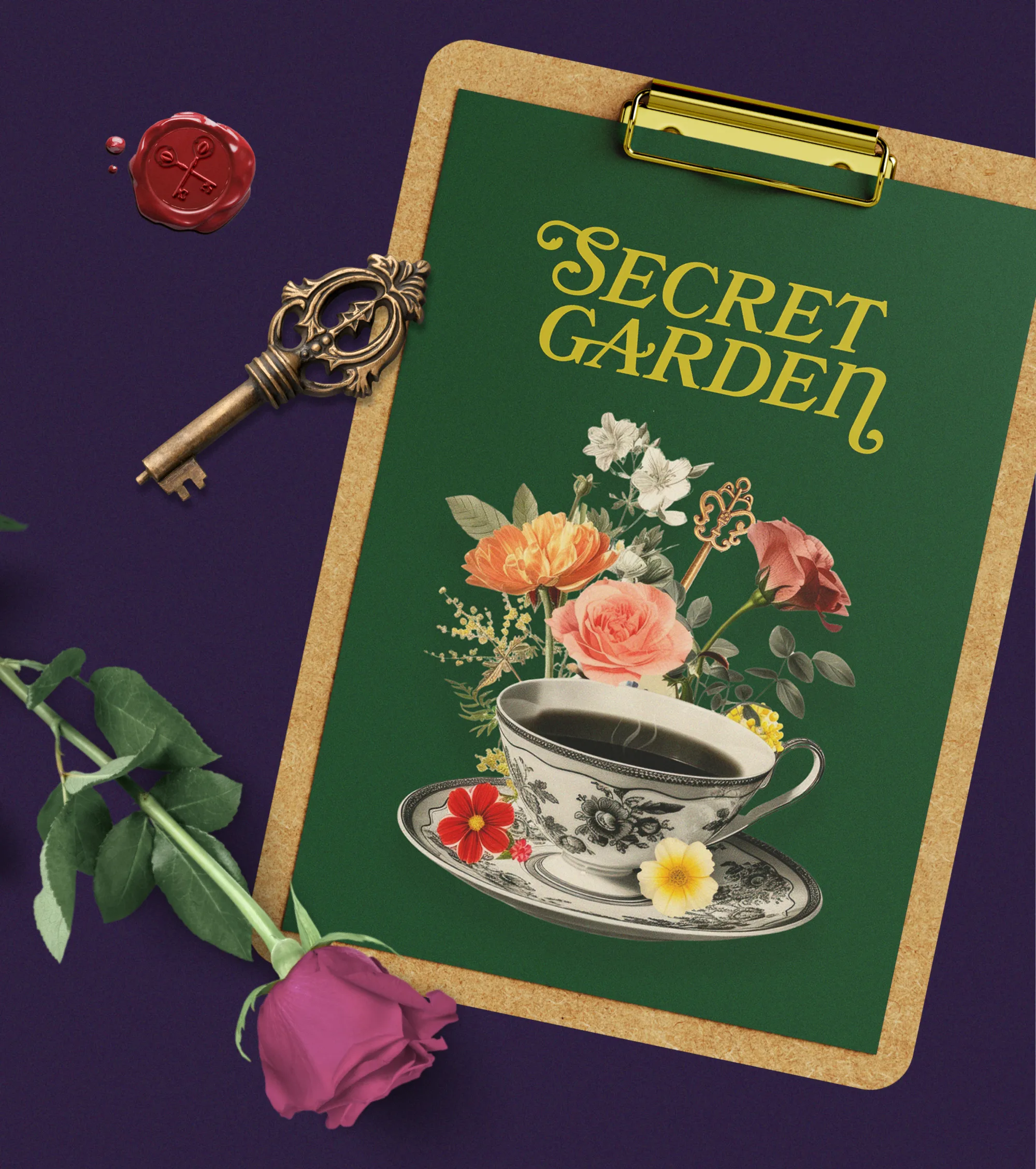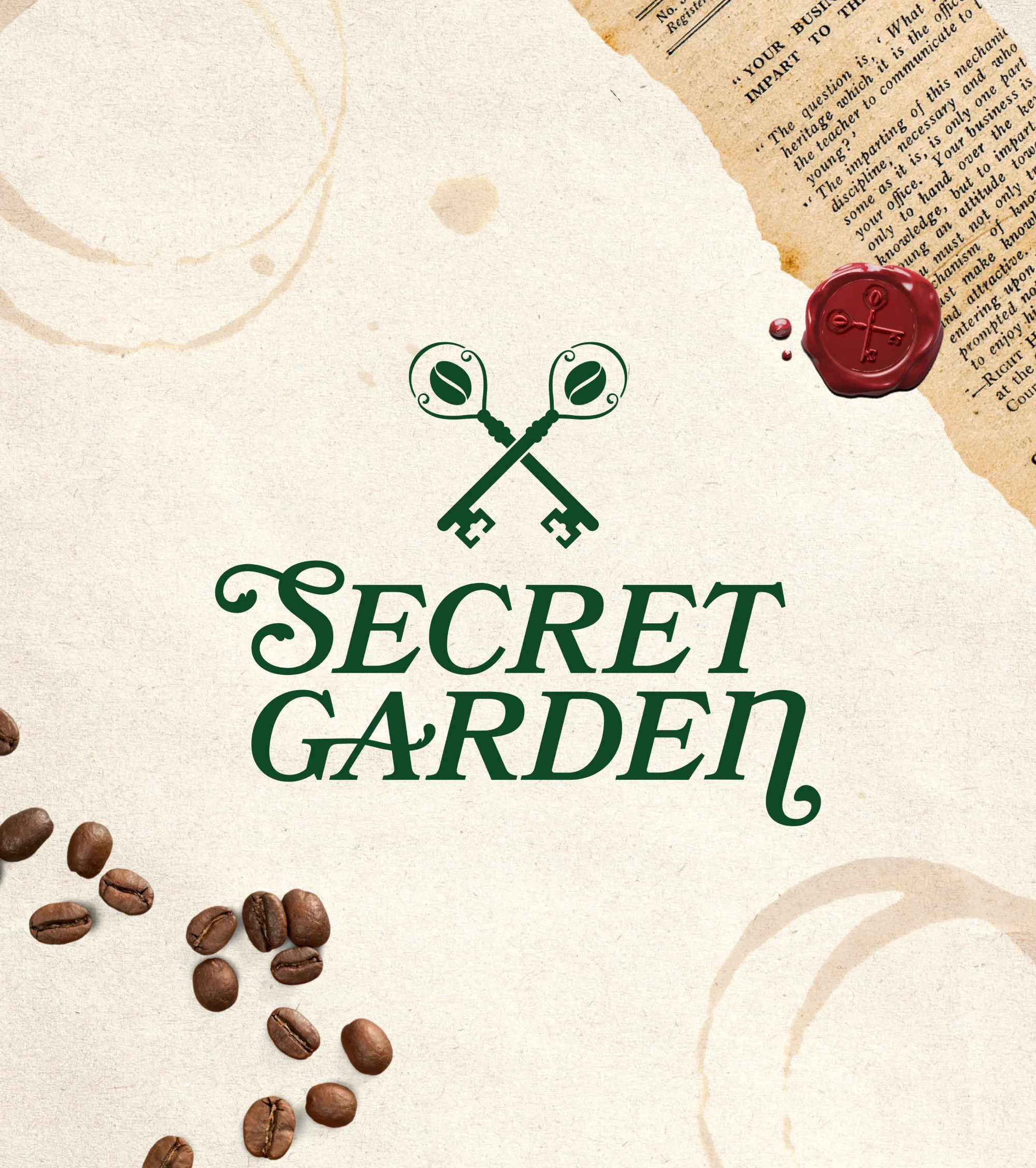 Celem było stworzenie marki, która nie będzie tylko „ładna”, ale opowie historię. W centrum systemu identyfikacji znalazł się sygnet: dwa skrzyżowane klucze, w których główki zostały zastąpione ziarnami kawy. To nieprzypadkowy zabieg – klucze symbolizują dostęp, zaproszenie do ukrytego ogrodu, zaś ziarna stają się dosłownym kluczem do smaku. To właśnie jakość, aromat i rytuał picia kawy są przepustką do tego świata. Połączenie zieleni ogrodu, głębokiego fioletu i złotych akcentów tworzy bogatą, ale elegancką kolorystykę. Tworzą aurę intymności i klasycznego uroku, przywołując na myśl sekretne herbaciane ogrody czy angielskie powieści sprzed wieku.